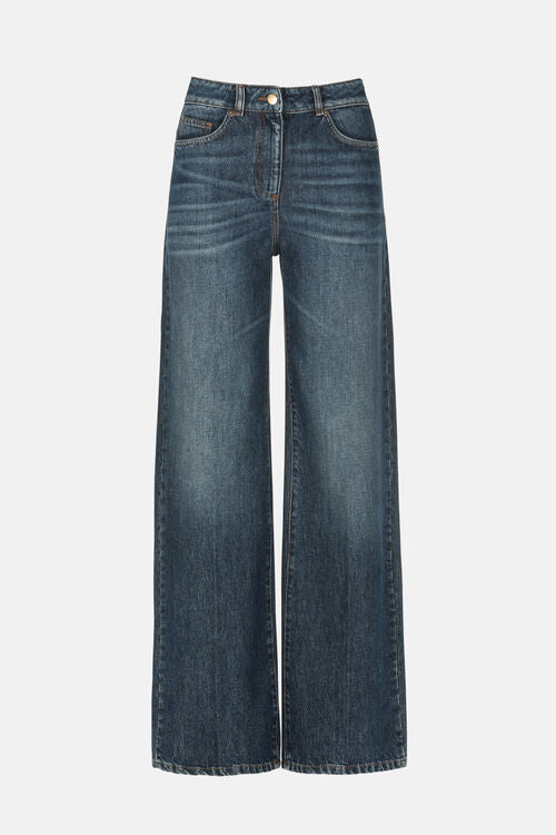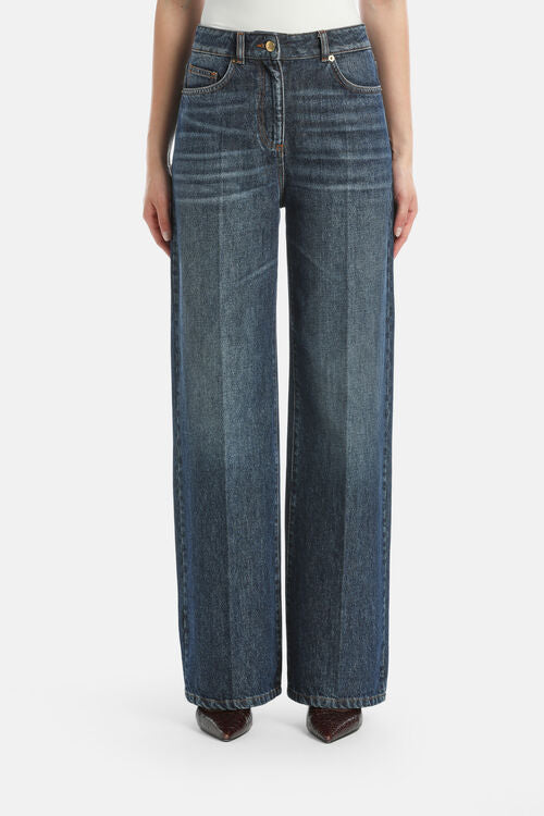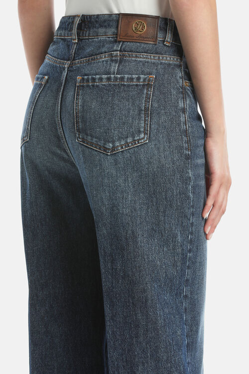 Five-pocket wide-leg jeans, washed for a worn look. Feature a gilded button embellished with “LS” engraving and a distressed leather tag with an iconic circular gilded metal appliqué.