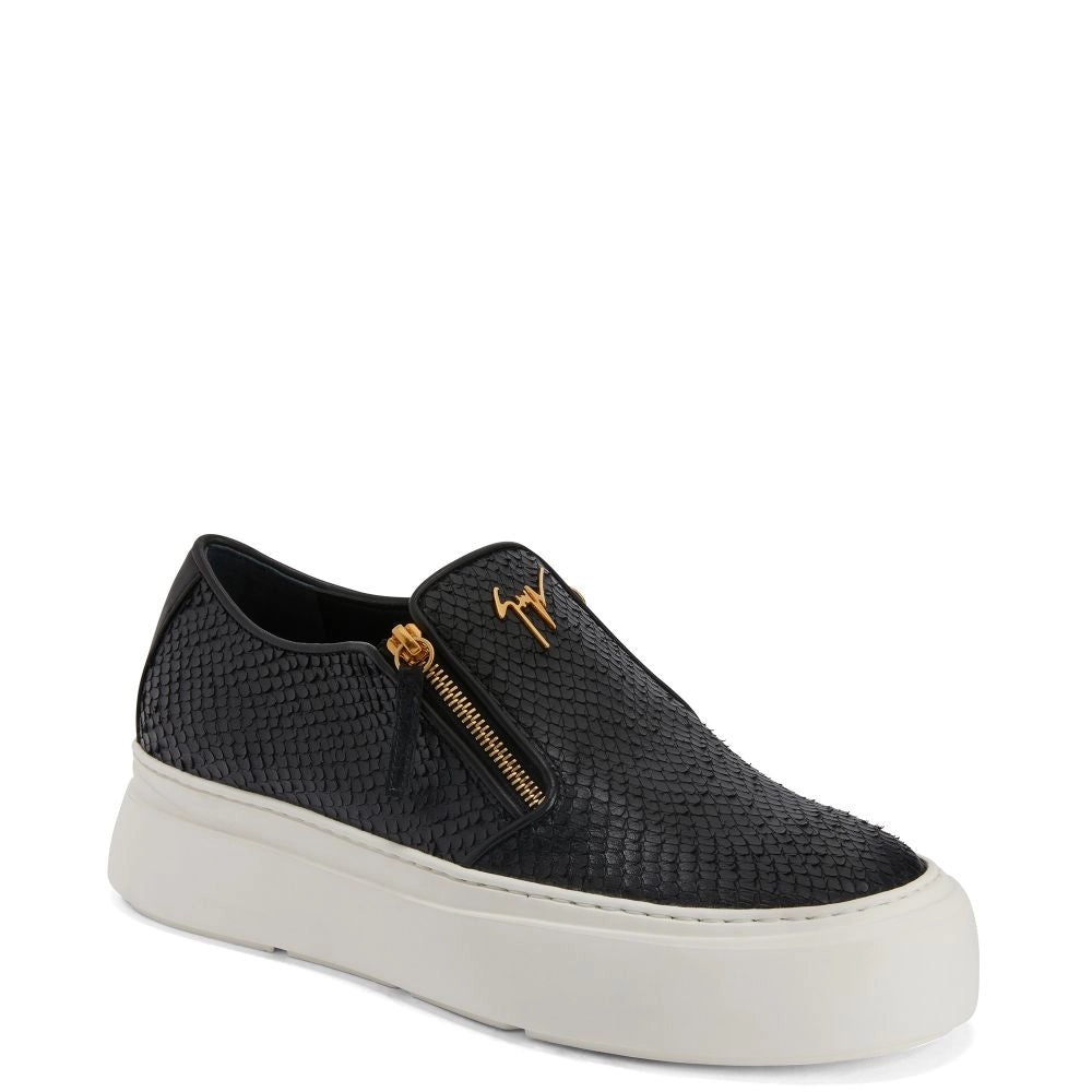 Slip-ons in reptile-print leather with leather details, two side zips and rubber sole.