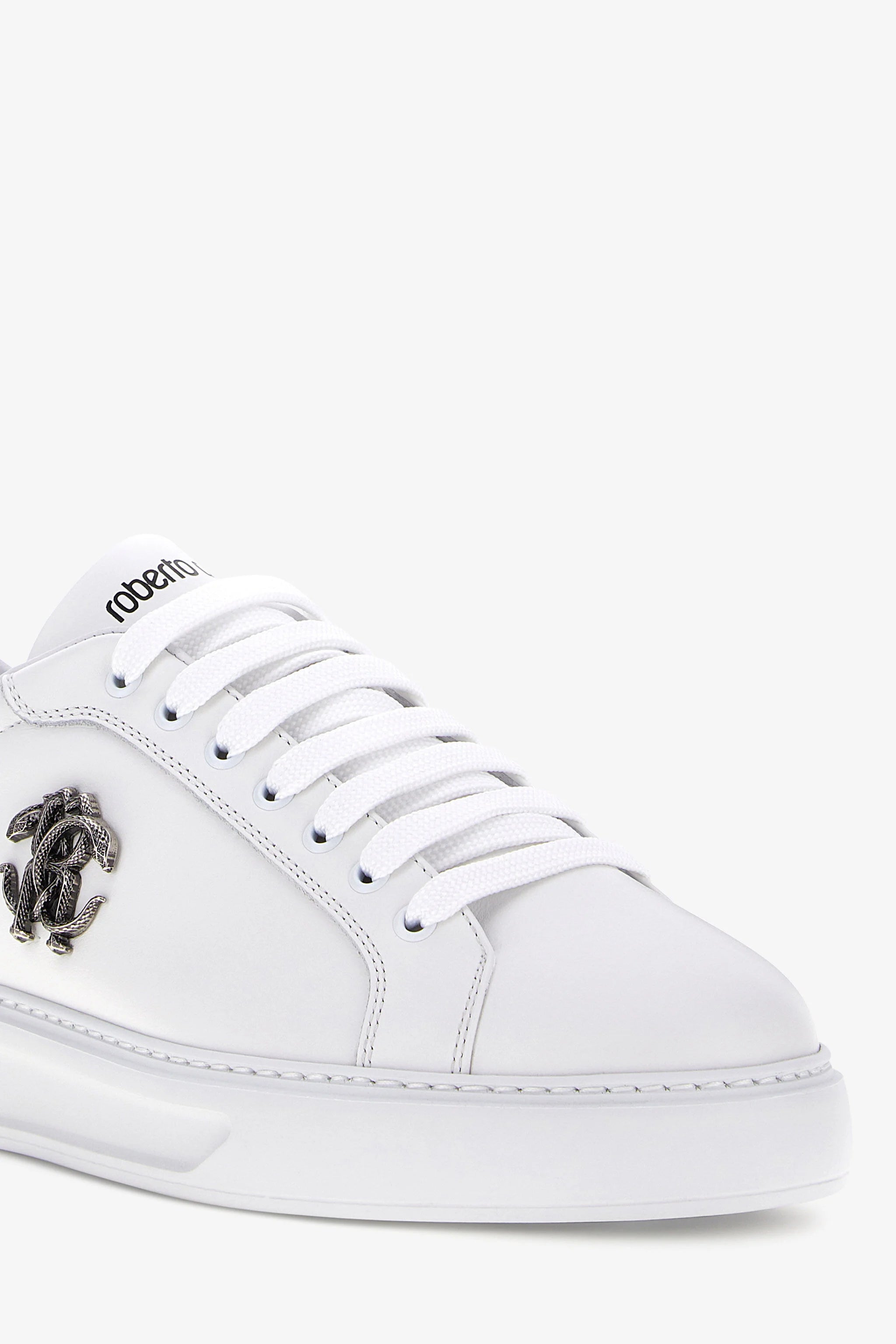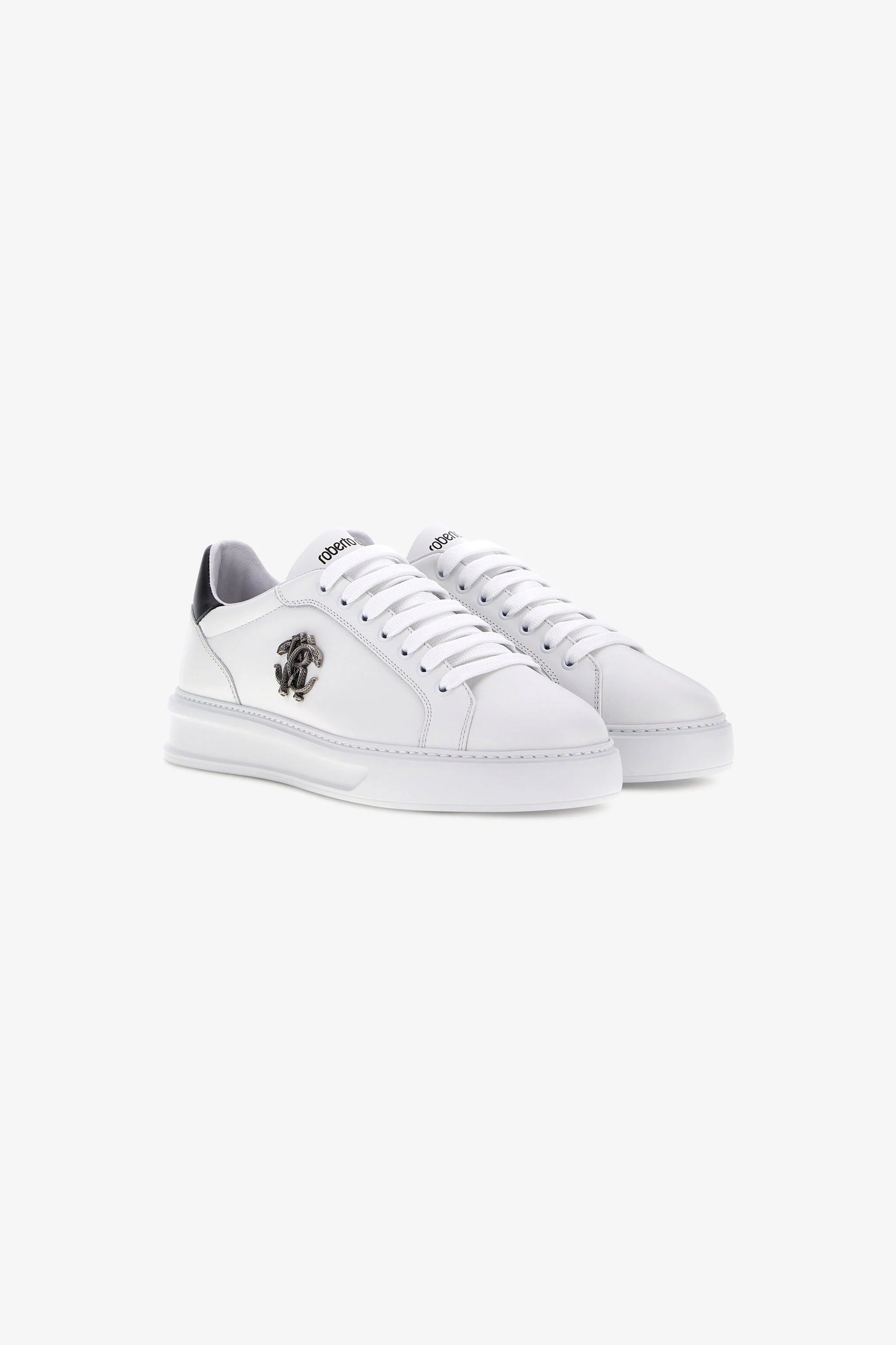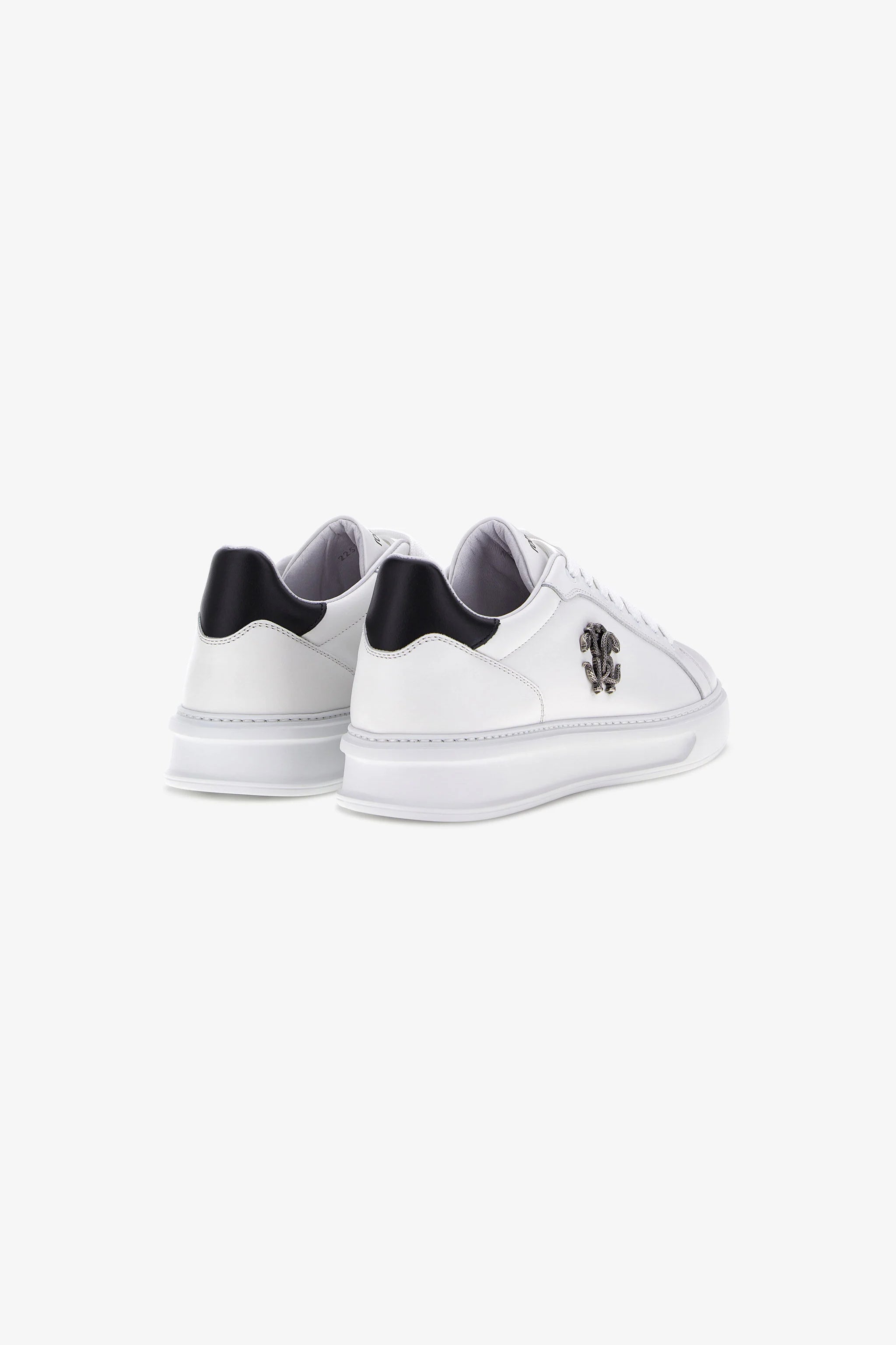 A masterpiece of contemporary design, these sneakers embody Roberto Cavalli's bold spirit. The pristine white leather upper offers a clean, versatile canvas, dramatically punctuated by the iconic Mirror Snake emblem in a polished metallic finish. Every step is a statement in understated luxury, a perfect fusion of urban cool and artisanal craftsmanship that elevates any ensemble with a touch of signature audacity.